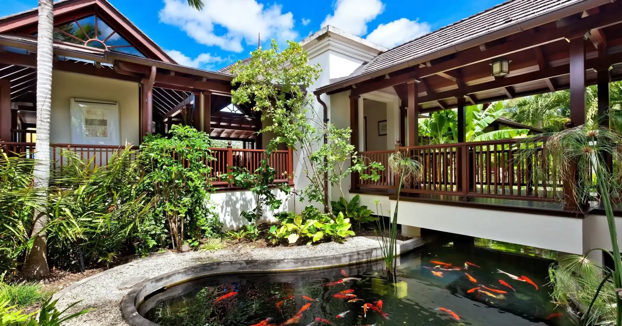 As you enter the grounds a lovely fountain greets you and as you walk through the entrance to the villa you are further soothed by oriental Koi ponds gracing either side of the wooden walkway. A large raised dining area that comfortably seats ten also includes a full wall water feature and is...