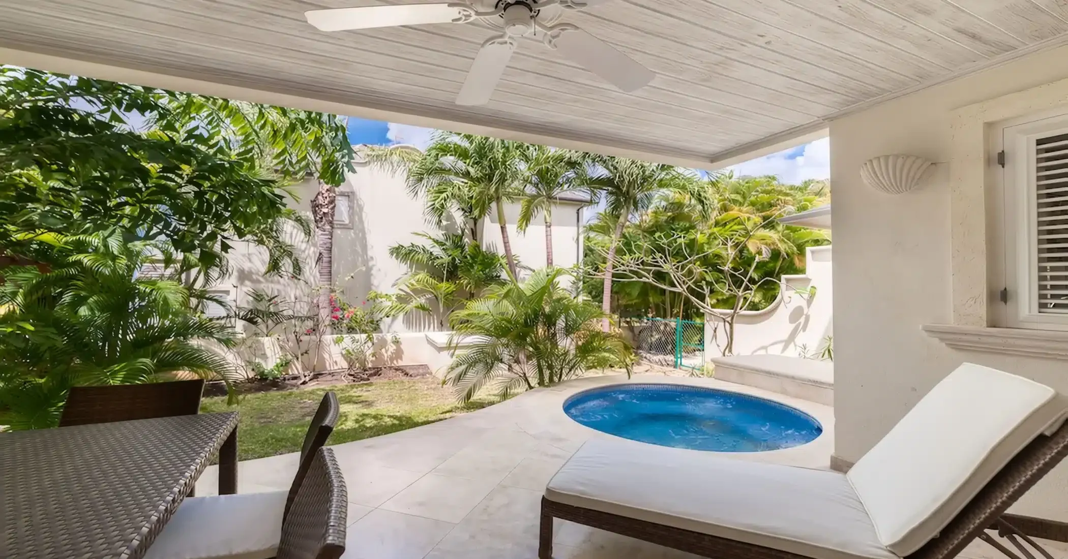 This charming three-bedroom townhouse offers a well-furnished retreat with a private garden and plunge pool, just minutes away from Mullins Beach in Barbados.