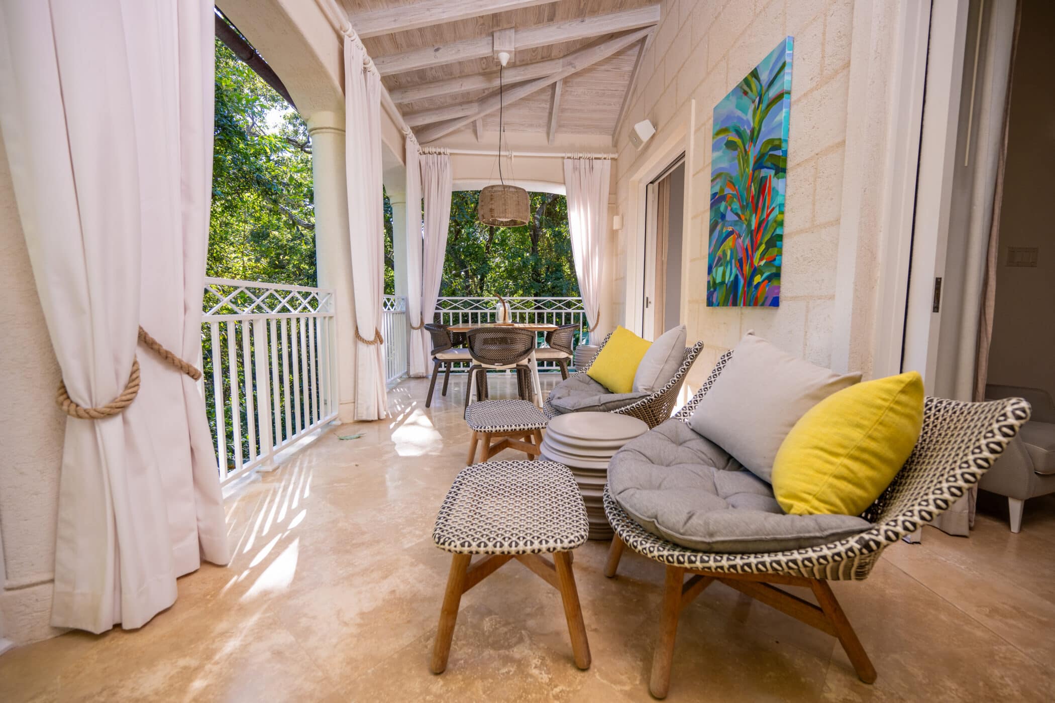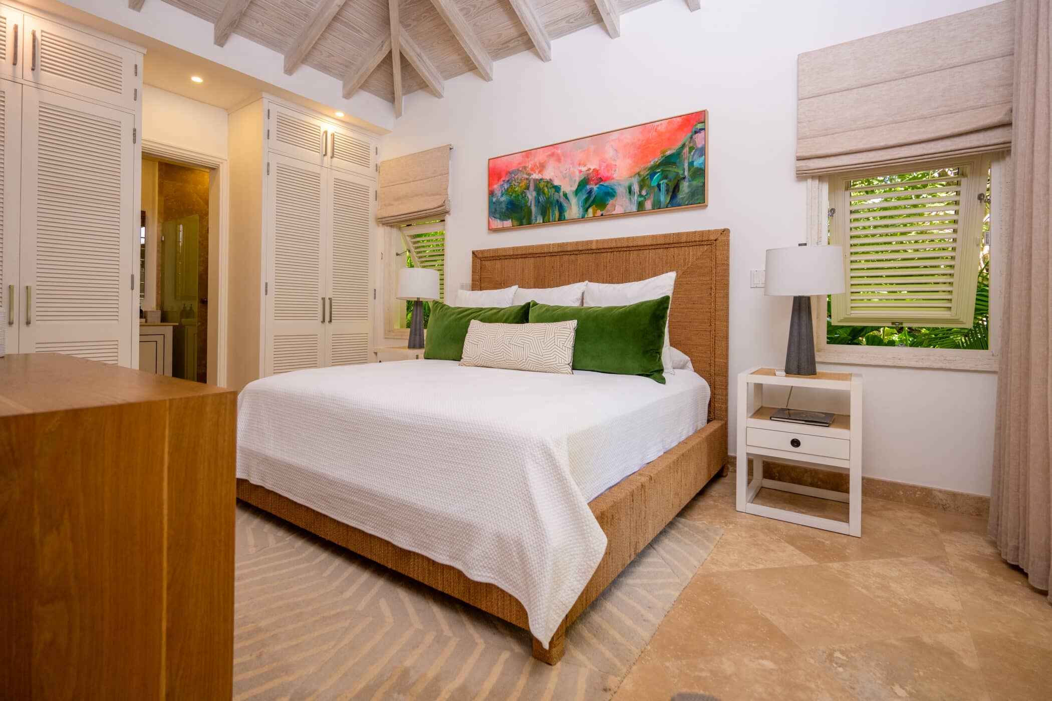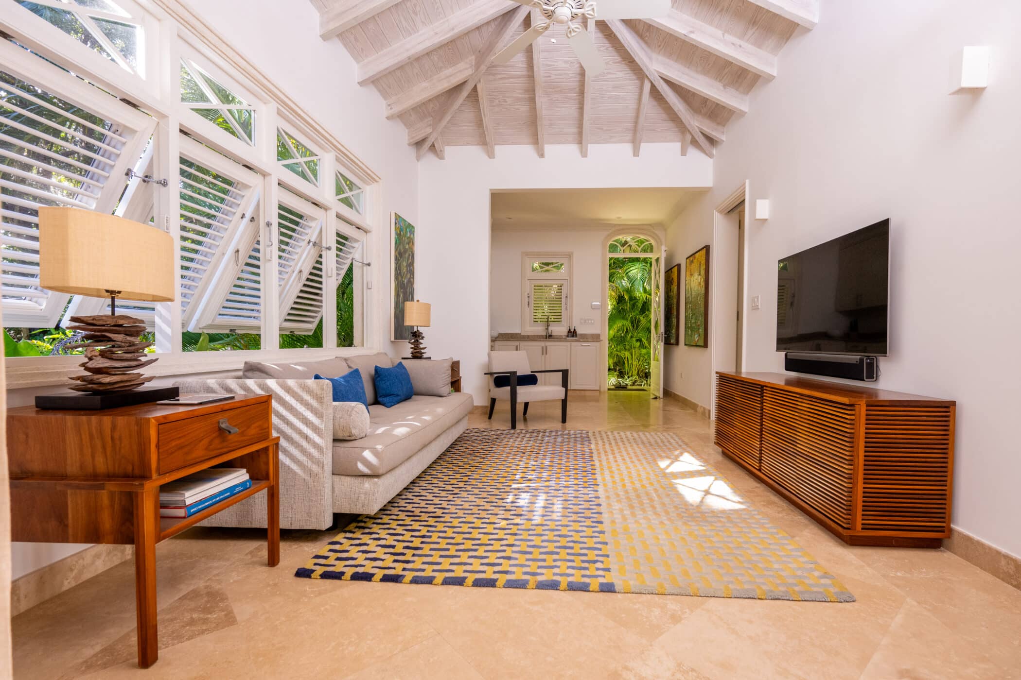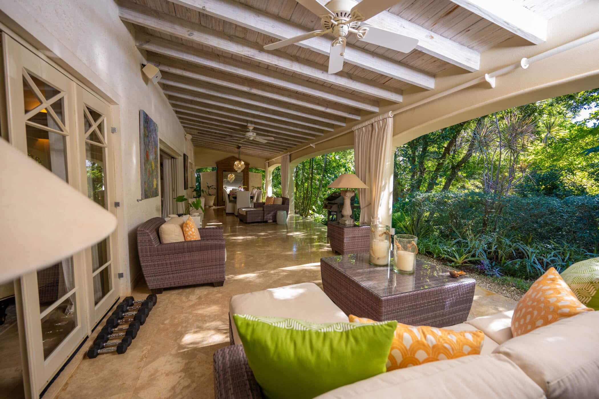 Greentails Villa 5, is a stunning 4-bedroom estate located 400ft above the Platinum Coast of Barbados, surrounded by constant breezes, mature trees, and lush tropical flora. This exquisite 3-bedroom, 3.5-bathroom villa spans approximately 2,700 sq. ft. and features a 1-bedroom guest cottage, offering additional private accommodation. The property epitomises luxury with high-quality finishes, natural stone floors, elegant bathrooms, and modern fitted kitchens with built-in appliances. Tray ceilings and open eaves, paired with ceiling fans, ensure a cool, comfortable environment throughout.