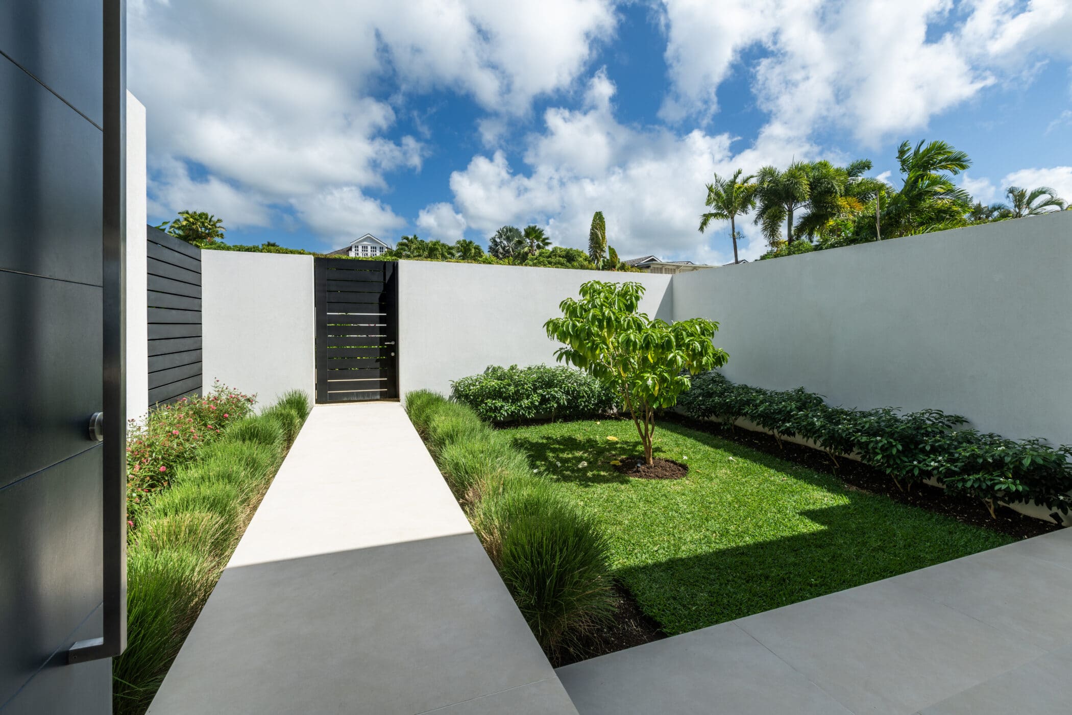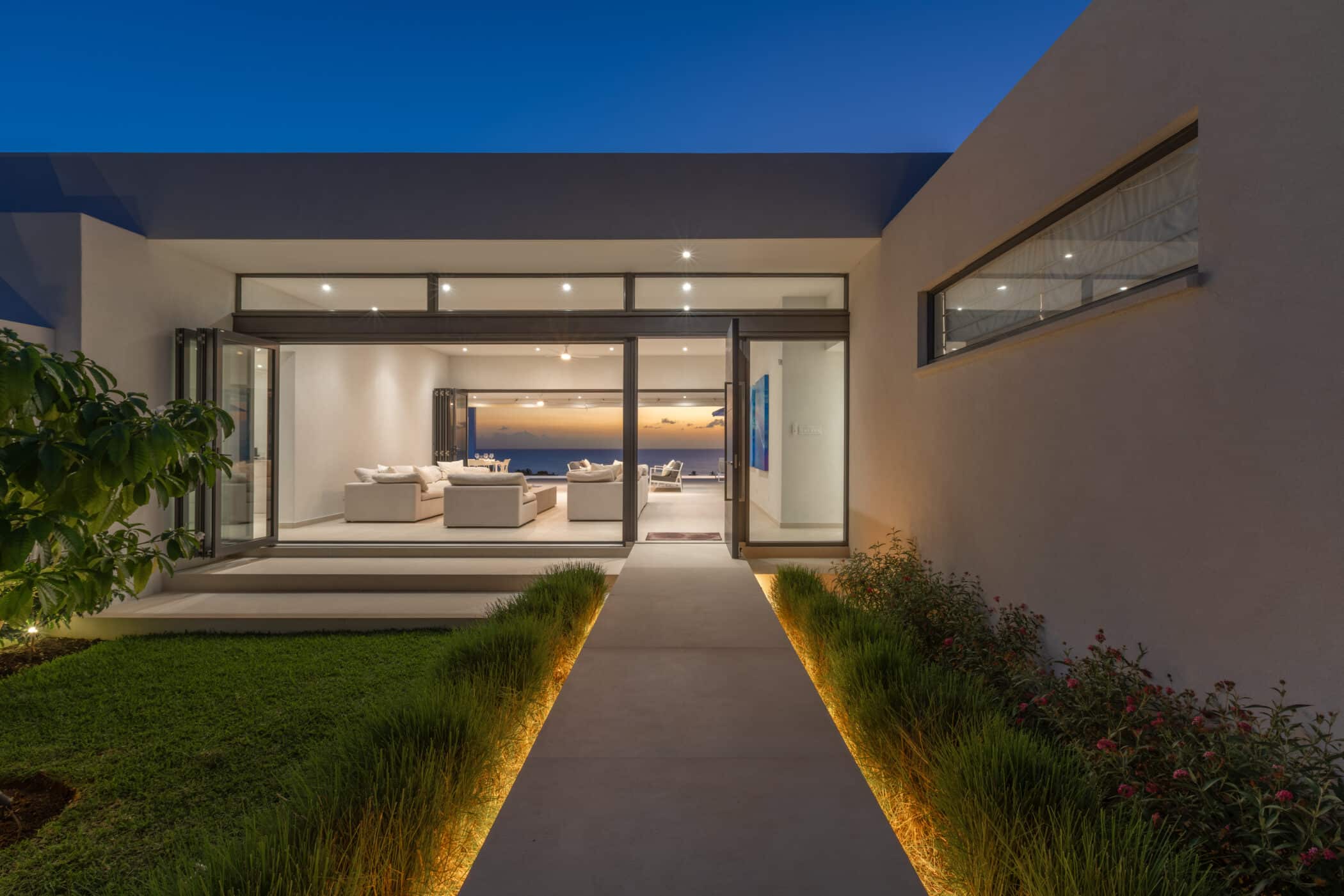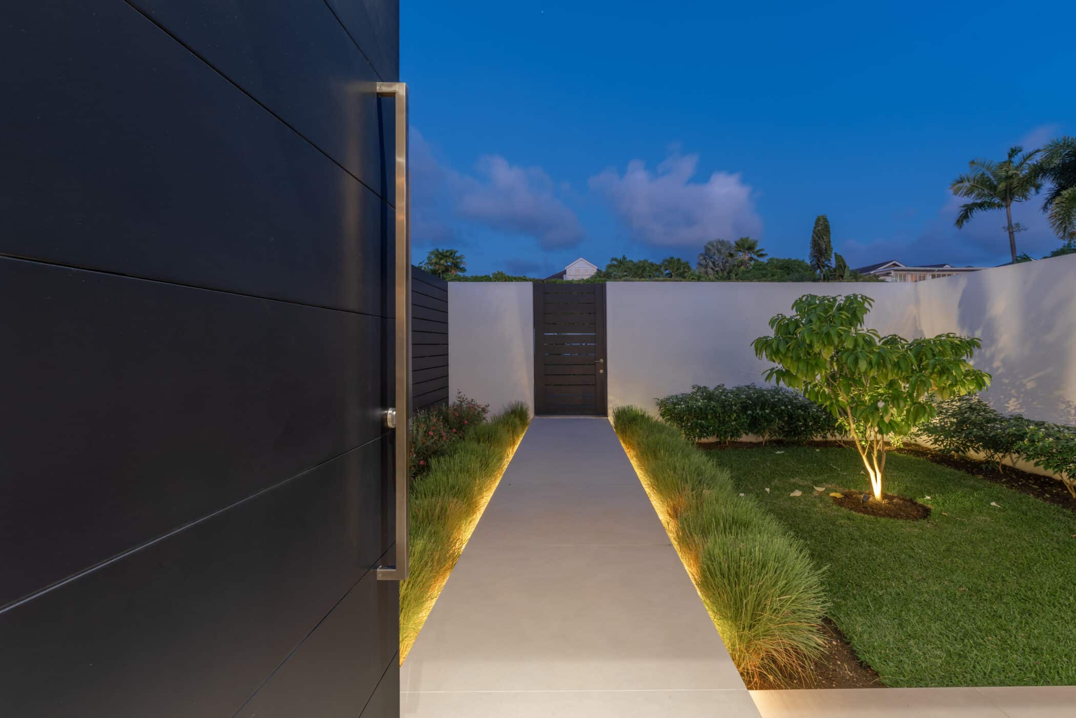 Enter through the serene courtyard gate, cross a graceful bridge framed by softly waving grasses and approach the impressive pivot door that opens to reveal panoramic sea views. A breathtaking welcome to your private island retreat.