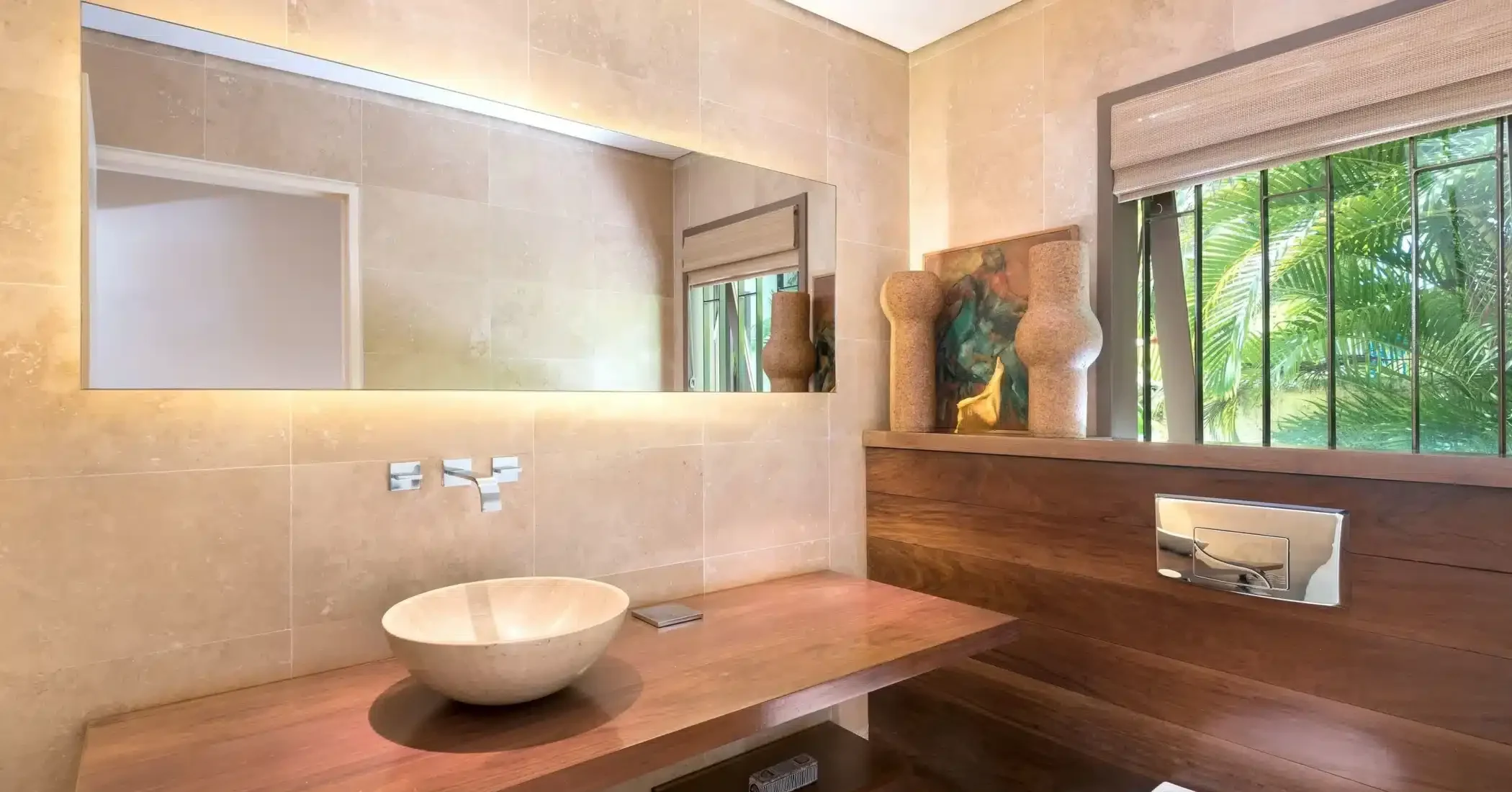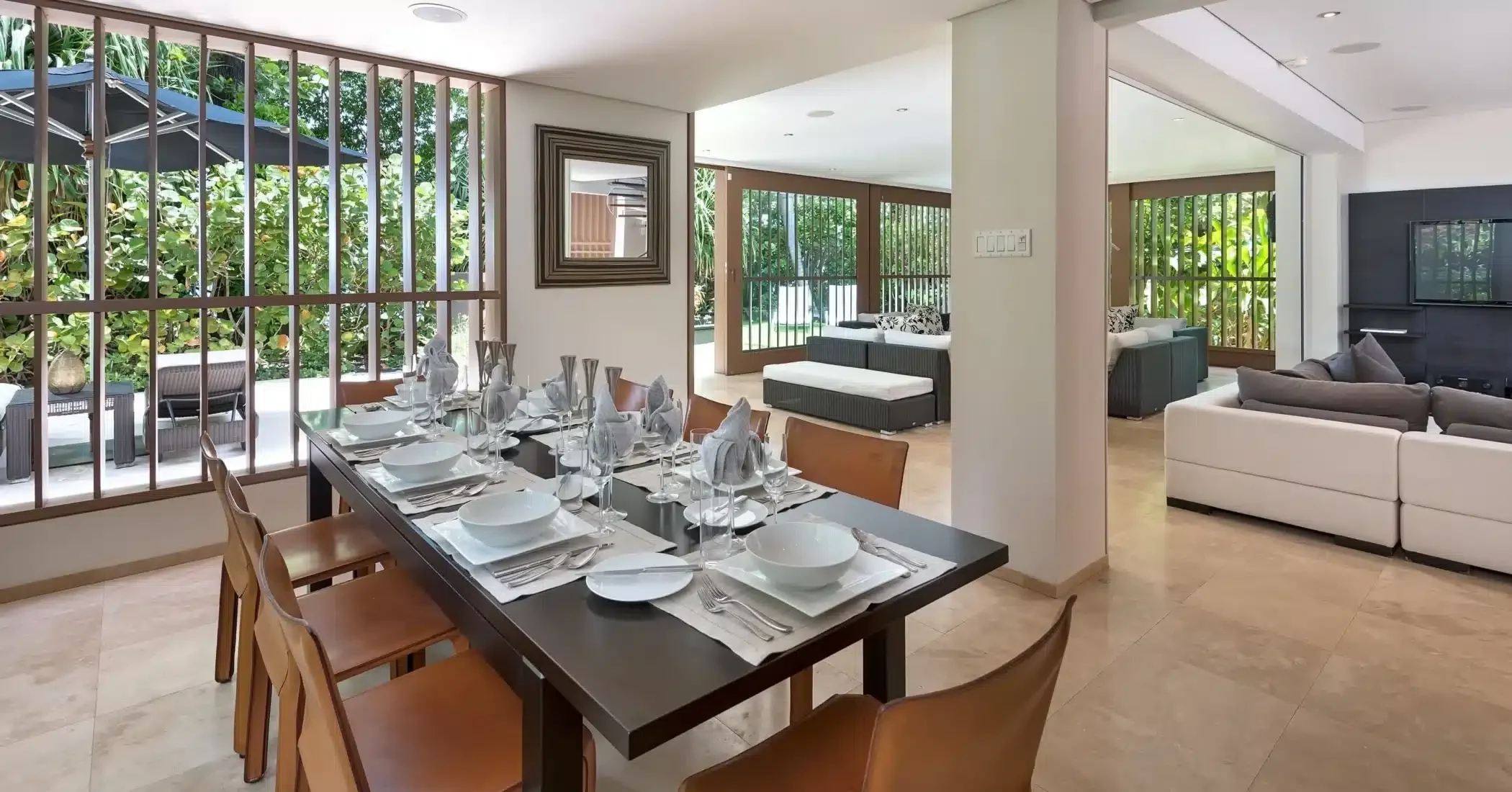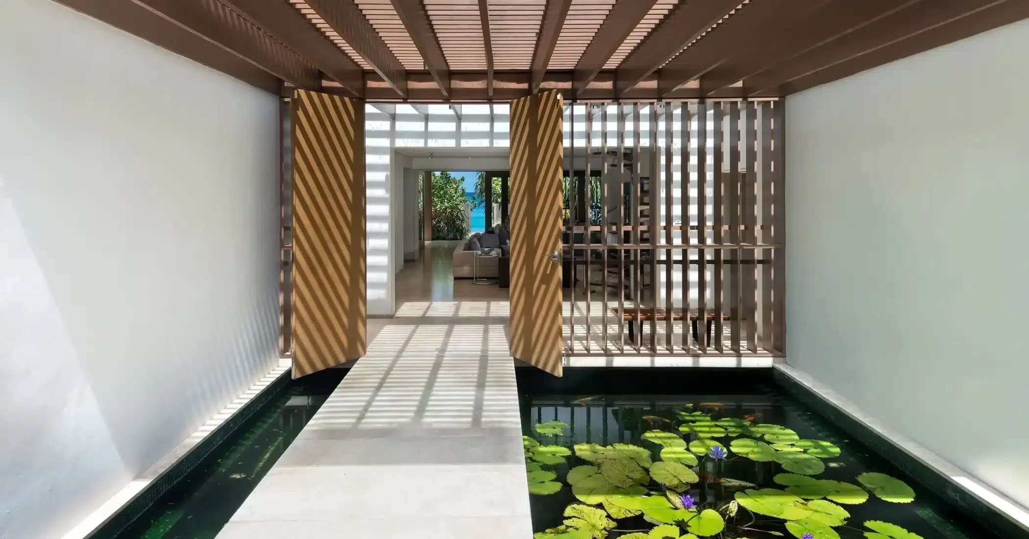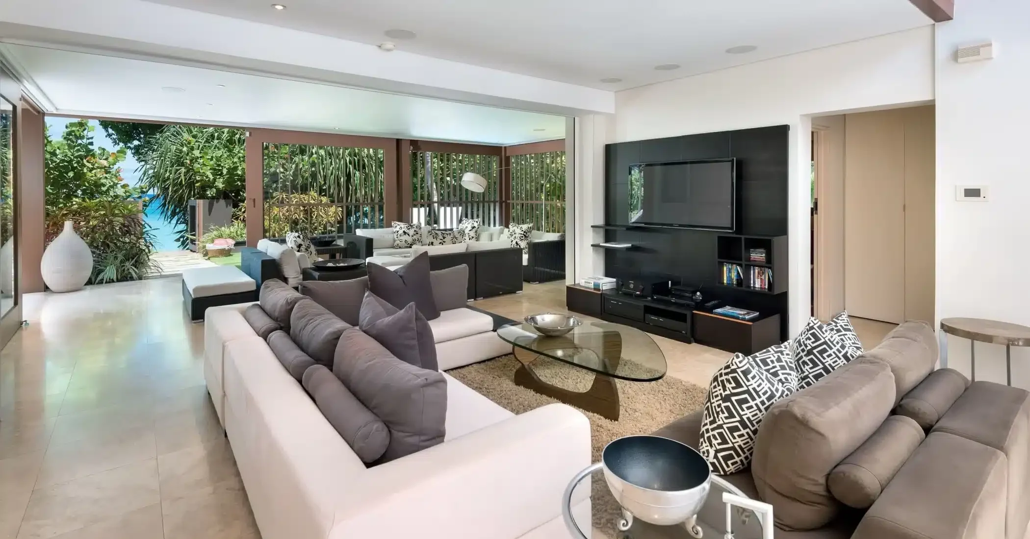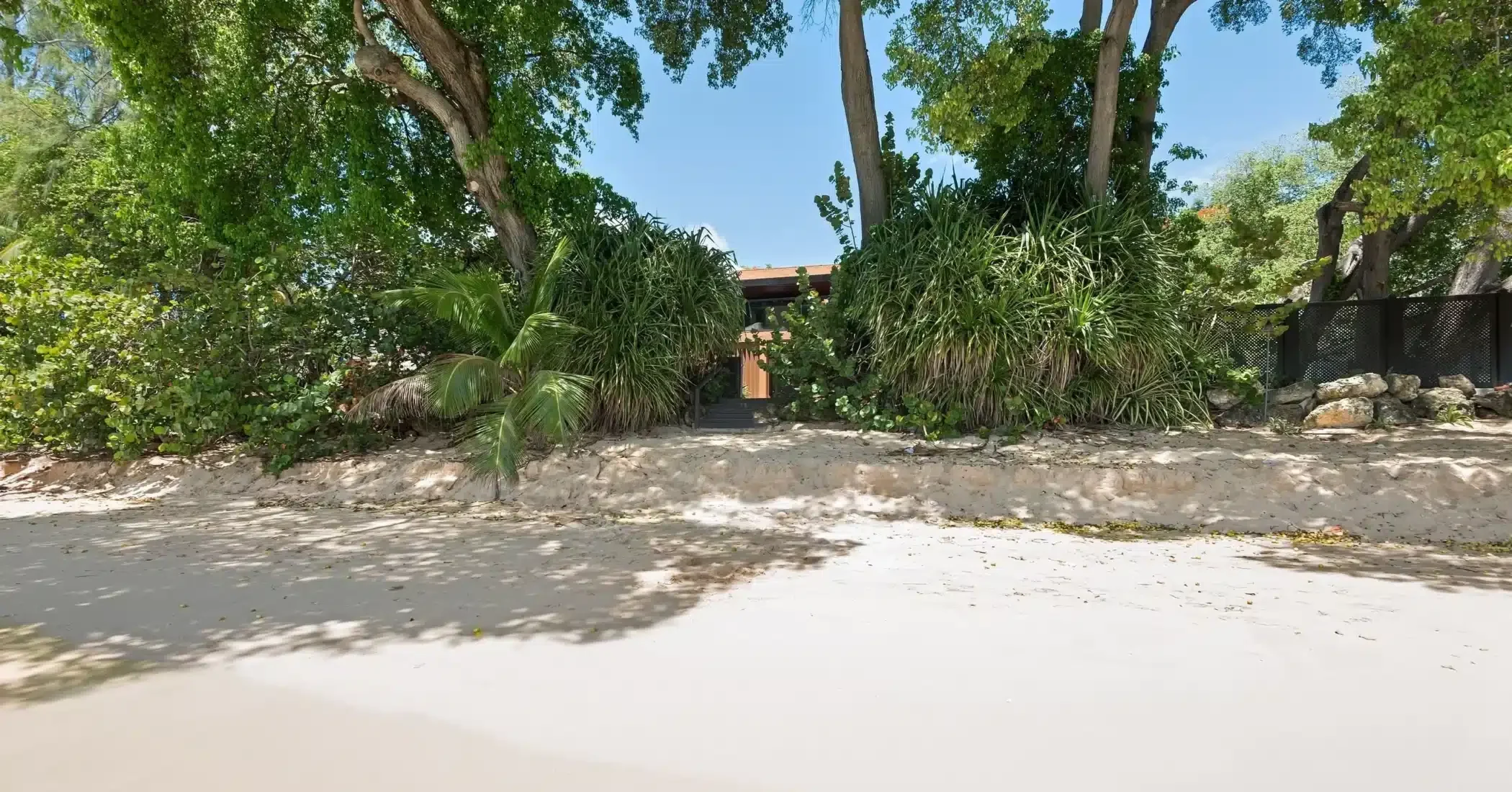 Set against a backdrop of towering trees and the aquamarine sea, this wonderful beachfront home has echoes of the Barbados wooden chattel house. Bold architectural layering with large living areas, surrounding louvre windows and oversized glass doors allows for extensive views of the garden and what is undeniably one of the best beaches in Barbados. Smooth granite finishes and plenty of glass reflects a minimalistic design approach and the straight lines and shape of the front entrance, hovering over a peaceful koi pond evokes a clear sense of sophisticated and modern tranquillity.
