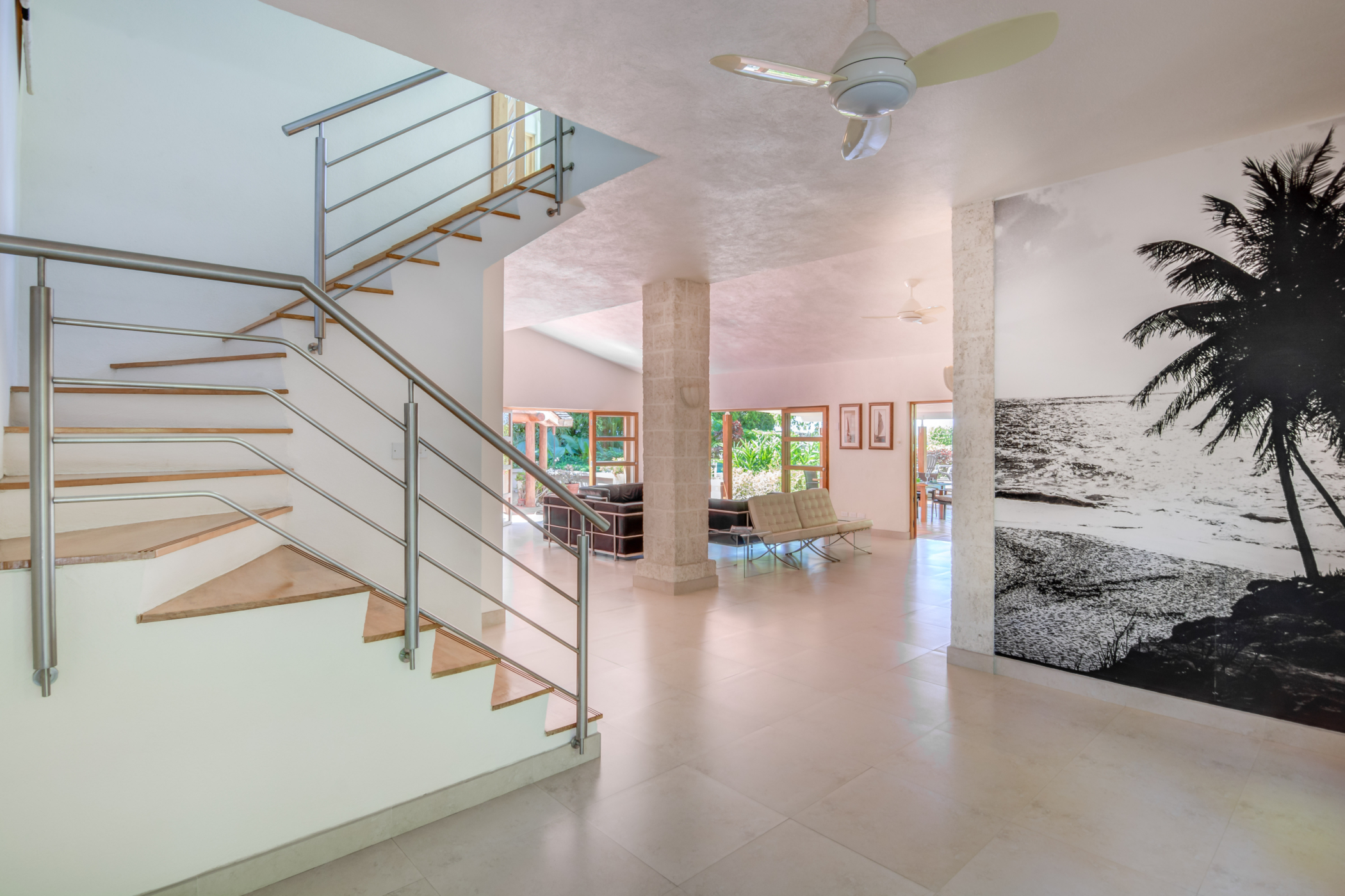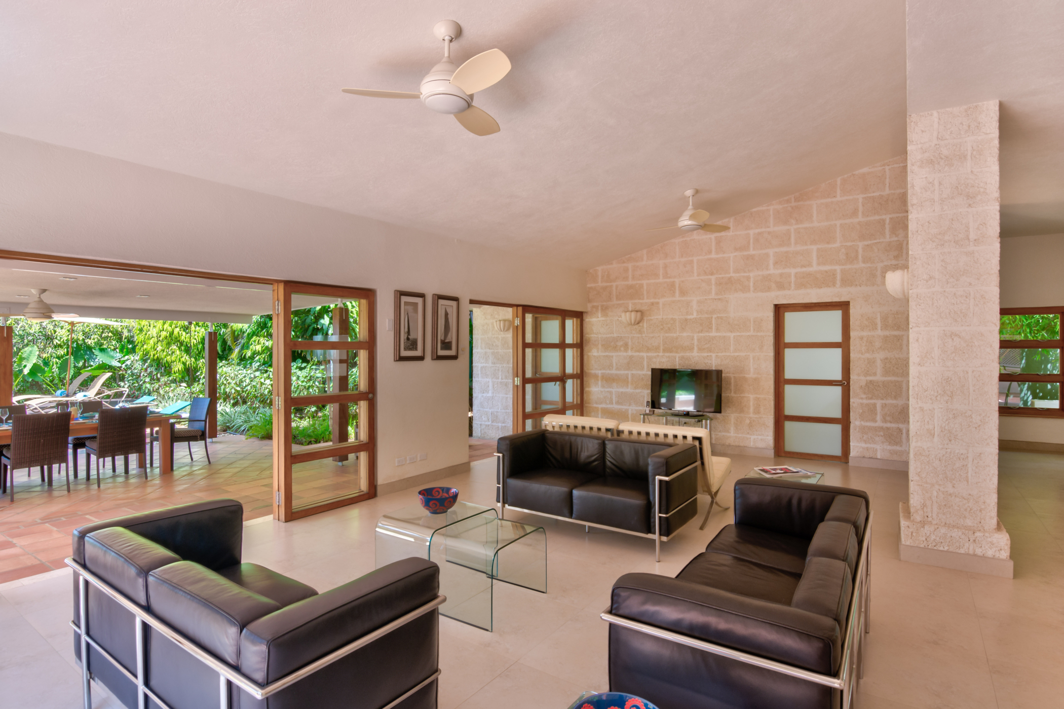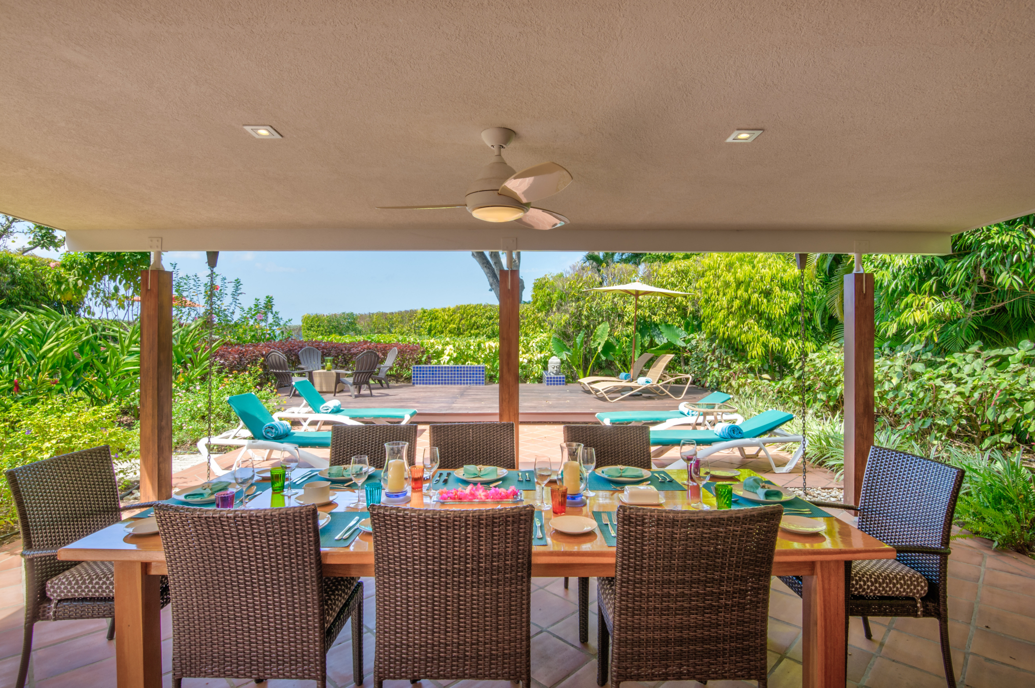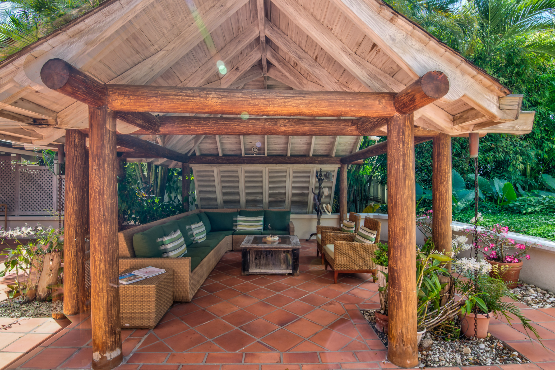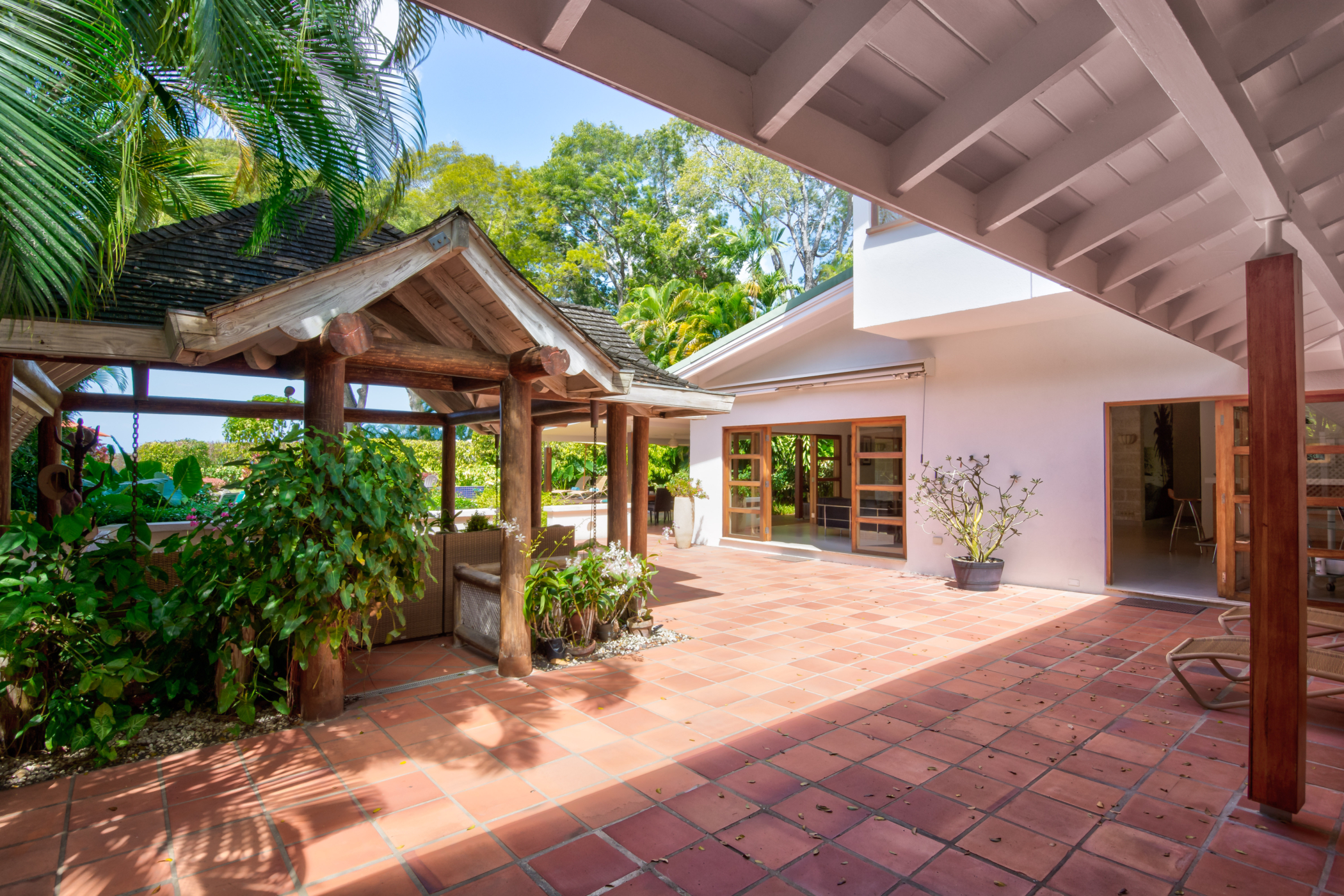 Nestled within the exclusive Church Point community on Barbados' West Coast, Thespina is a charming beachfront holiday rental that epitomises contemporary luxury. This exquisite villa boasts multiple outdoor living spaces on the back terrace, including a dining gazebo and stylish patio furnishings, all enveloped by lush tropical gardens that offer both seclusion and breathtaking ocean views. A private gateway leads directly to the pristine white sands and turquoise waters of the beach, just steps away from the villa.