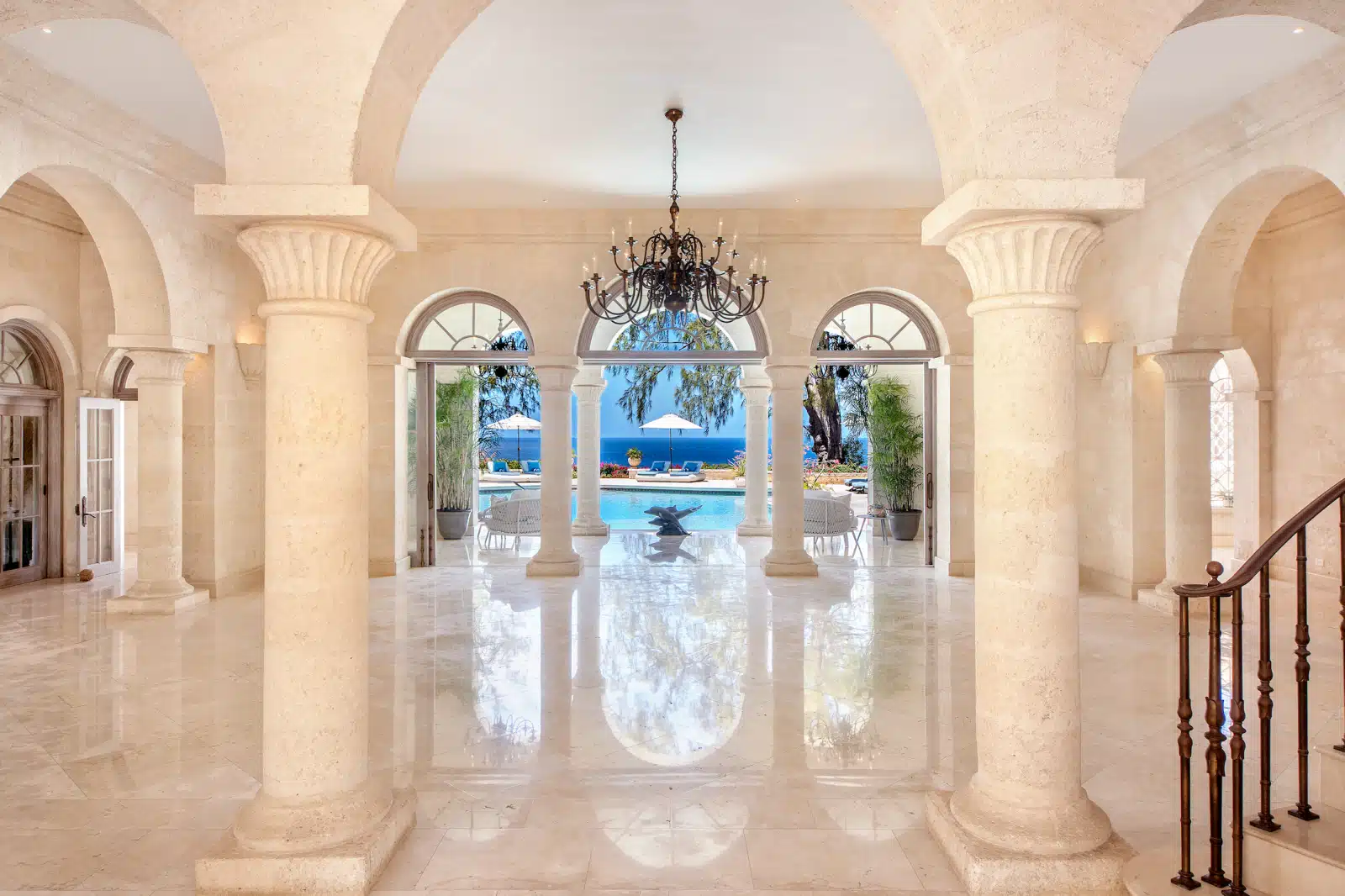 Designed by renowned local architect, Larry Warren with meticulous attention to detail, the beautiful interiors of Westfield feature hand-carved coral stone and select Italian marble floors throughout the expansive 18,000 sq ft home, built to showcase the impressive Bizazza tiled pool along with uninterrupted panoramic views of the platinum coast of Barbados.